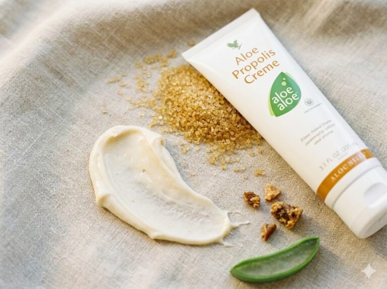 Warum es wirkt: Die Aloe Propolis Creme ist extrem reichhaltig und enthält rückfettendes Bienenpropolis und Kamille. Der Zucker sorgt für ein sanftes Abtragen der Schüppchen, ohne die Haut zu reizen.